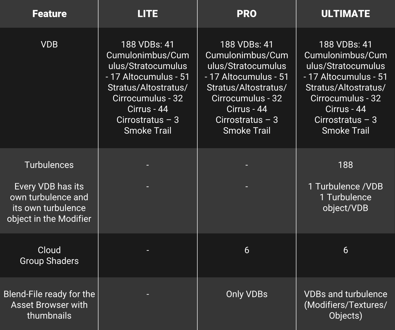 188 photorealistic clouds in VDB format and 188 turbulences. 6 group Shaders, 10 categories of clouds in 6 groups and 1 Shader/Cloud group. For Cycles and Eevee.